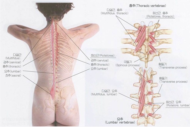 이런 다열근이나 횡복근은 추체(척추)에 작게 붙어 있으면서 요추, 추간판, 인대 (특히 후방의