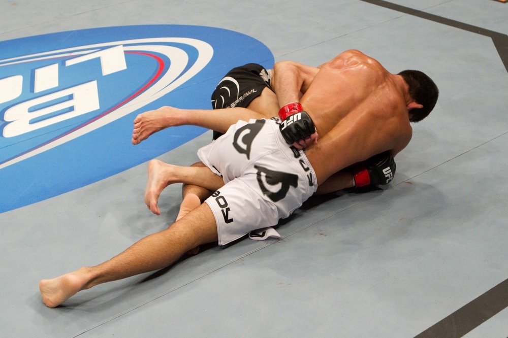 일단 둘 다 암트라이앵글(Arm triangle choke) 초크의 일종입니다. 팔을 하나 끼고 목을 감아서 경동맥에 압박을 주는 기술이죠.