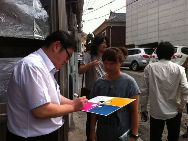 마포 생선구이집 앞에서 싸인하는 김용민 PD