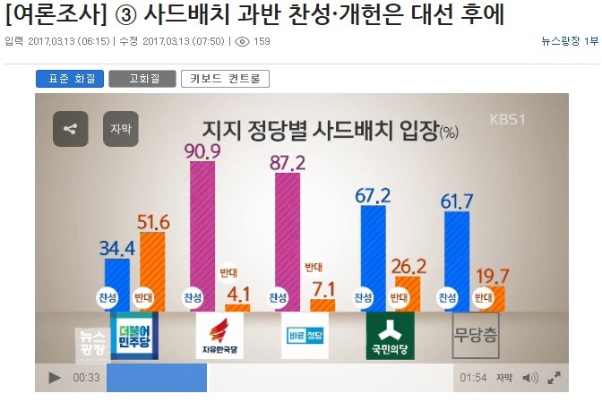 사드설치 찬성여론이 꾸준히 과반을 넘게 나오고 장비까지 한국에 들어왔다. 이제 사실상 사드배치는 싫든좋든