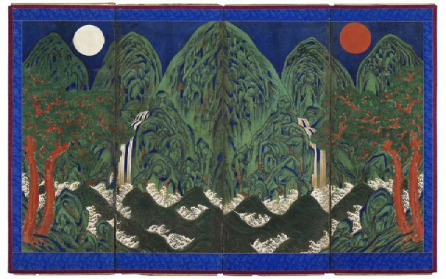 국립고궁박물관이 오는 12일 개막해 7월5일까지 ‘궁궐의 장식그림’을 주제로 하는 특별전을 개최한다. 이 자리에는 일월오봉도 창호(1조4짝. 사진)를 비롯한 그림 창호 19건 58점과 궁궐 실내 벽면에 부착했던 벽화인 부벽화(付壁畵) 2건 2점 등이 선보인다. 2009-05-08