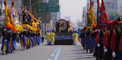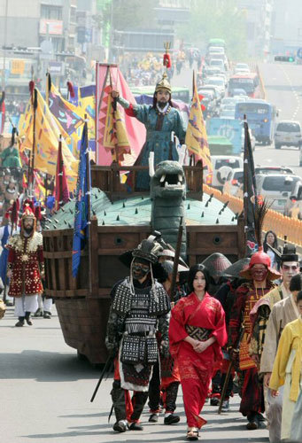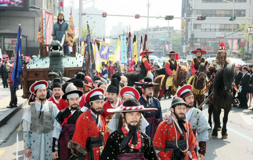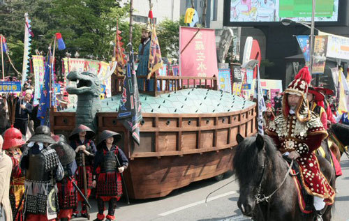 충무공 이순신 장군의 탄생 464주년을 맞아 28일 서울 중구 일원에서 거북선을 앞세운 가장행렬이 행진을 하고 있다.