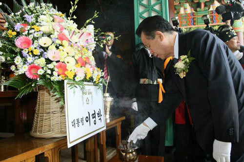 한승수 국무총리가 28일 오전 충남 아산 현충사에서 열린 `충무공 탄신 기념다례' 행사에 참석해 분향하고 있다.