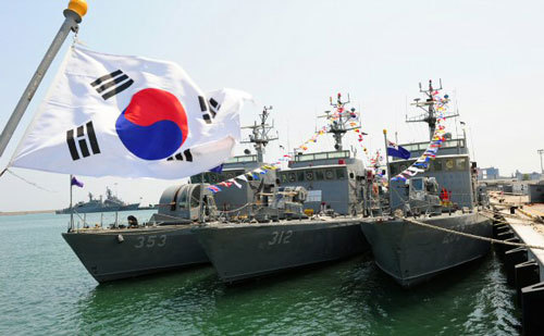 해군 제1함대사령부는 28일 충무공 탄신 제464주년을 맞아 동해항 등에 위치한 전 함정이 모든 깃발을 게양하는 만함식을 개최했다.