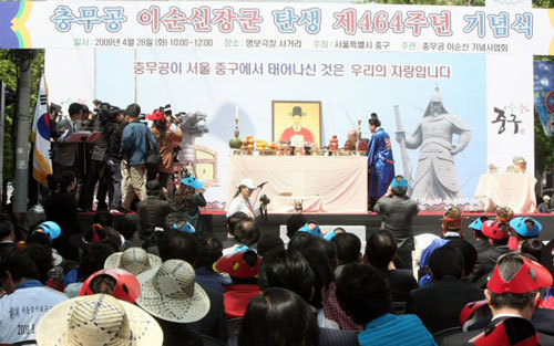 28일 충무공 이순신 장군의 생가터 표석이 있는 서울 명보극장앞에서 열린 충무공 탄생 464주년 기념식에서 영정이 봉안되고 있다. 2009-04-28