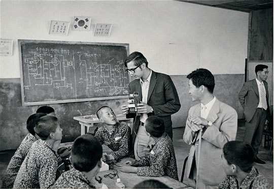 1971년 서울 김포공항 전기교육장에서 미국 평화봉사단 단원(가운데)이 기계를 들고 설명하고 있다. 국제교류재단 제공.