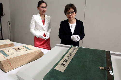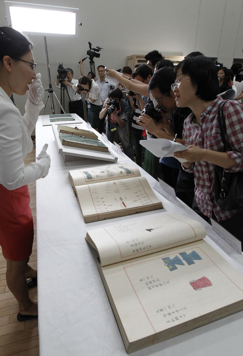 취재진들이 4일 오후 서울 용산구 국립중앙박물관 수장고 유물포장실에서 공개된 숙종인현왕후가례도감 등 프랑스에서 돌아온 외규장각 의궤를 살펴보고 있다. 사진-이정아 2011-07-04