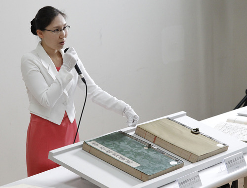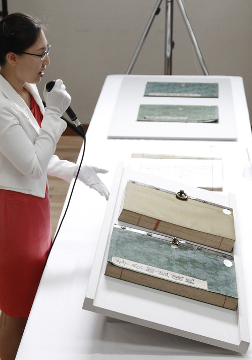 국립중앙박물관 유새롬 학예연구사가 4일 오후 서울 용산구 국립중앙박물관 수장고 유물포장실에서 공개된 숙종인현왕후가례도감 등 프랑스에서 돌아온 외규장각 의궤에 대해 설명하고 있다. 2011-07-04