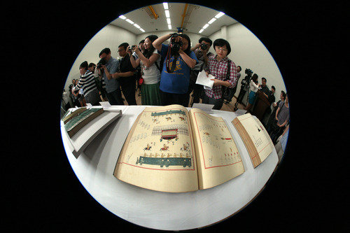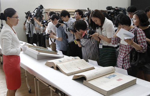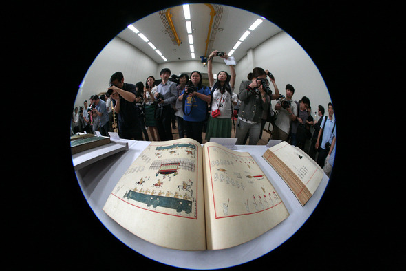 국내외 취재진이 4일 오후 서울 용산구 국립중앙박물관 수장고 유물포장실에서 공개된 숙종인현왕후가례도감 등 프랑스에서 돌아온 외규장각 의궤를 살펴보고 있다. 2011-07-04