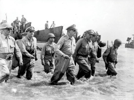 맥아더 장군(오른쪽에서 두번째)의 위대함은 언제나 새로운 도전을 두려워하지 않고 늘 변화를 추진했다는 데 있다. 맥아더는 일본군의 약점을 명확히 간파해 ‘개구리 뛰기 전술’이라는 역발상 전법을 구사함으로써 태평양전쟁을 승리로 이끌었다.