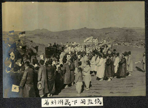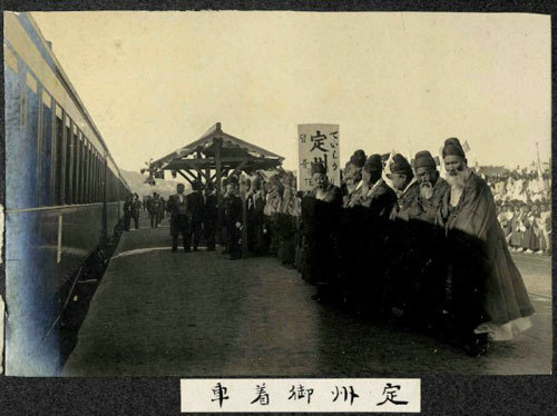 1909년 이토 히로부미가 순종을 모시고 서북순행을 할 때 정주역에 도착한 모습.