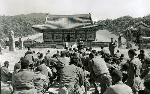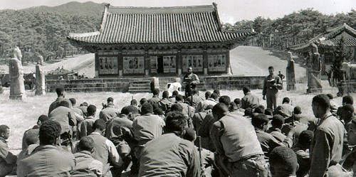 1951년 3월 18일 미 25사단 23여단 소속 병사들이 경기 남양주시의 홍릉에 모여 앉아 예배를 올리며 잠시 평온한 시간을 보내고 있다.