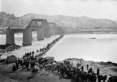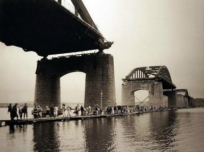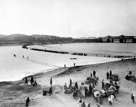 한강 인도교 옆에 임시로 놓인 부교를 건너 피난을 떠나는 서울 시민들 - 1951년 4월 29일
