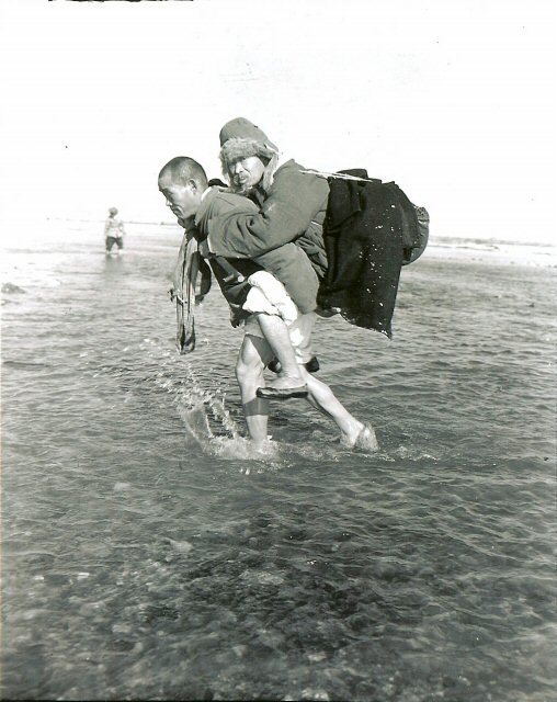1951년 1월 14일. 늙은 아버지를 엎고 서울 한강을 건너 피난가는 주민의 모습.