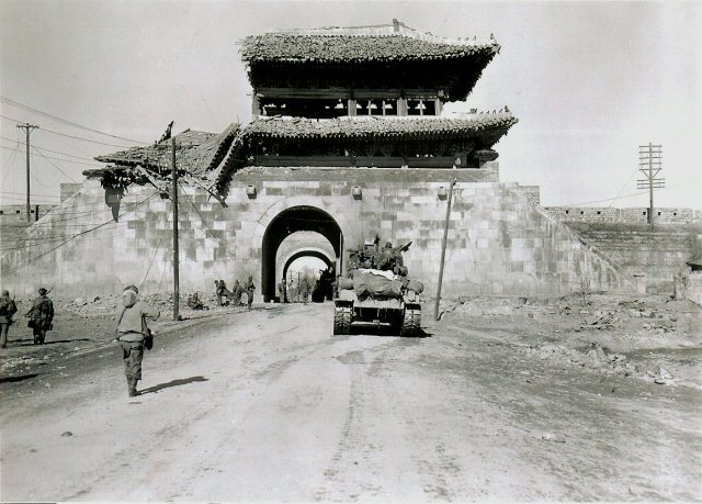 미 보병 제25사단 병력이 폭격으로 부서진 수원성을 지나가고 있다. 1951.1.25.