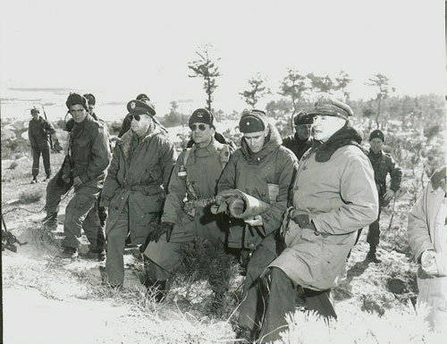1950년 전장을 순시하는 맥아더 사령관. 가운데 인물은 리지웨이 사령관.