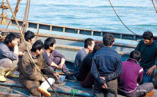 지난달 8일 북한 당국이 나포했다가 13일 만에 풀어준 중국어선의 선원들이 고향으로 귀환하는 배의 갑판에서 휴식을 취하고 있다. [다롄 AP]