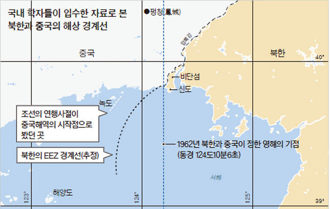 전통적으로도 한반도 서해의 북부 해역 경계는 북한이 중국과 설정한 경계선보다는 훨씬 넓다. 조선 시대 해로(海路)를 통해 명(明)나라를 오갔던 사절단의 기록에 따르면 더욱 그렇다. 조선의 중국 사절인 연행사의 기록을 오래 연구해 온 동국대학교 서인범 교수는 “방대한 연행록의 기록을 보면 조선의 선비들은 현재 중국 랴오닝(遼寧)성 관할인 녹도(鹿島)와 해양도(海洋島)에서 중국의 해역이 시작된다는 인식을 하고 있는 경우가 많다”고 말했다.