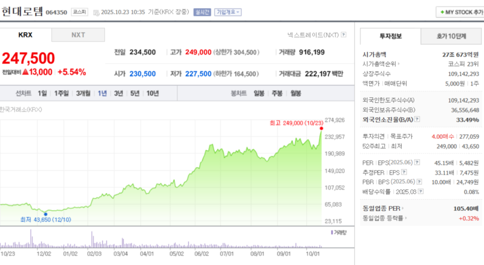현대로템도 올해 370% 상승하여 시총 10조 넘는 종목 중에서 가장 상승률이 큰 종목으로 3분기 실적도 좋고 철도 사업도 잘 되어 증권사 목표가 30만원 나오고 있습니다. 이런 주식은 잠간 조정 받아도 그냥 가지고 가면 됩니다. 개인적으로는 현재 100여개 보유 종목 중 5%로 가장 비중이 큰 종목입니다. 5년 넘게 보유하면서 10배 이상 수익이 났습니다.