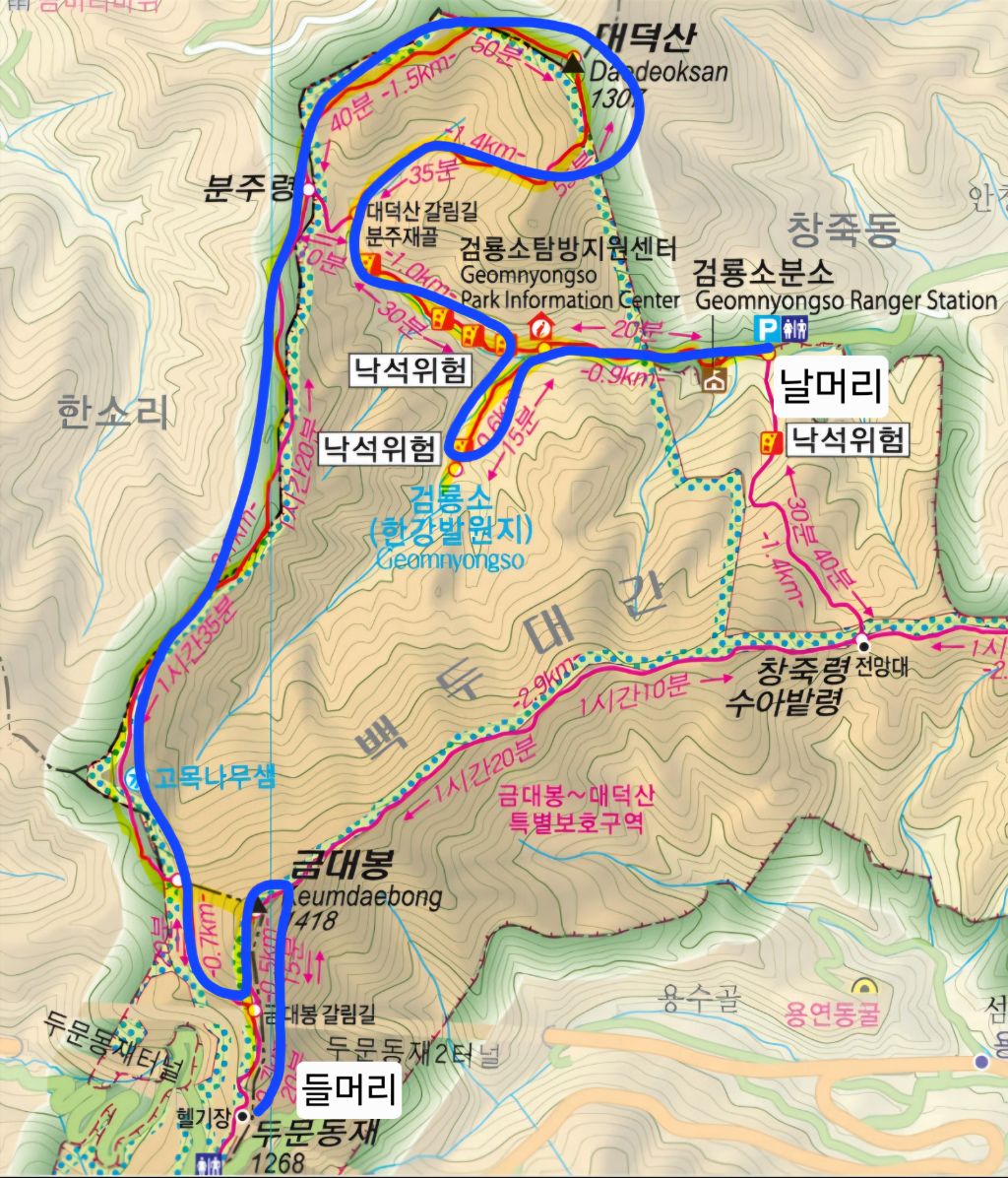 두문동재 -> 금대봉 -> 분주령 -> 대덕산 -> 검룡소 -> 검룡소 주차장 (10km)