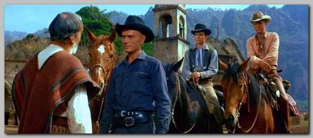 율 브린너, 스티브 매퀸, 찰스 브론슨, 제임스 코번, 로버트 본, 브래드 덱스터 및 독일의 젊은 배우 호르스트 부크홀츠 등이 7인의 건맨이고 성격파 배우 엘라이 월랙이 금이빨을 한 간악한 산적 두목 칼베로로 나오죠.