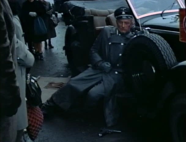 치명적인 부상을 입은 하이드리히, 쓰려져 있는 모습을 둘러서서 쳐다보는 프라하의 시민들