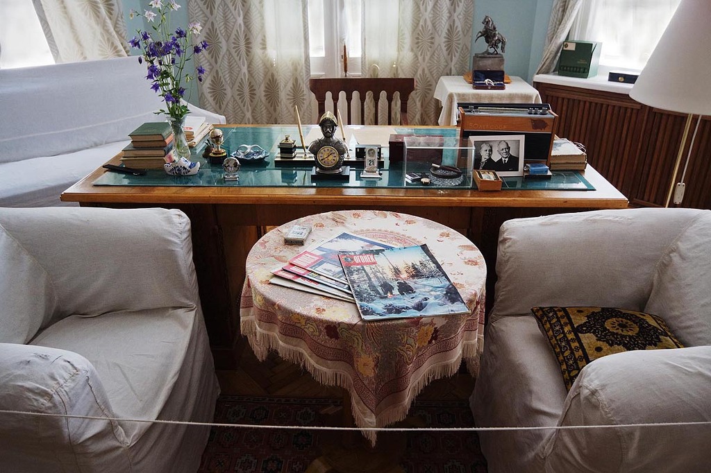청색 나무에 하얀 덧문들이 달린 2층짜리 건물은 아담합니다. 전형적인 코사크의 주택이라는데, 낮은 아래층이 물건 두는 곳간이고 위층의 살림방은 뜰에서 바로 올라갑니다. 2평쯤 되어 보이는 마룻바닥의 좁다란 방이 <고요한 돈 강>을 쓴 서재입니다.