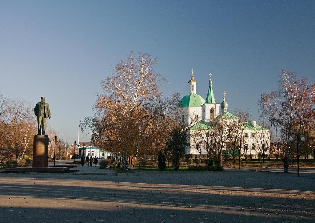 뵤쉔스카야의 문학박물관 앞은 광장이 넓습니다. 옛날 코사크들이 모여 집회를 하던 시장 광장이요, 지금도 마을의 중심 광장이 되어 있습니다. 광장의 한쪽 가에는 녹색 돔의 성당 건물이 높다랗습니다. 이 광장이 <고요한 돈 강>에 나옵니다.