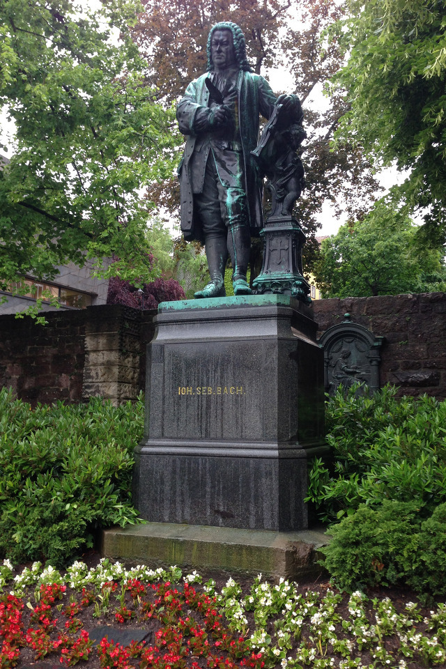 손에 깃털 펜을 든 입상(立像)은 1884년 바흐가 세례를 받은 성(聖) 게오르겐 교회 앞에 세워졌던 것인데 1938년에 생가 곁으로 옮겨졌습니다. 이 동상을 세울 때는 리스트, 지휘자 뷜로, 바이올리니스트 요하임 등이 모금 운동을 벌였다고 합니다.