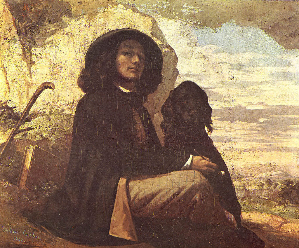 1842년에 제작해서 44년의 살롱에 첫 출품, 입선한 쿠르베의 23세 때 작품입니다. 고향인 쥐라 산중의 봉누보 골짜기에 있는 프레질 퐁테뉴 동굴 앞에서 스패니얼 종의 개를 데리고 포즈를 취하고 있는 쿠르베의 자화상입니다.