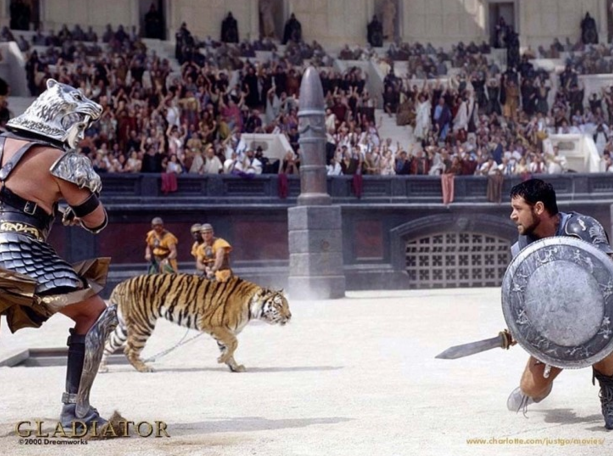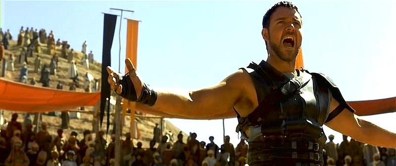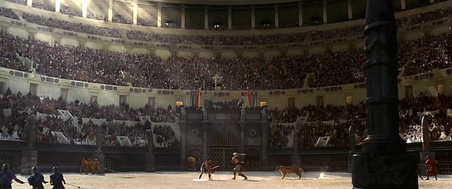 검투사 시합에서 막시무스는 오랜 시간 전장에서 다진 실력을 바탕으로 승리에 승리를 거듭합니다. 검투사로서 그는 스페인 출신이라는 뜻의 스패냐드라는 이름으로 불리는데, 승리를 거듭하면서 영웅이 된 스패냐드는 마침내 로마의 콜로세움에서 열리는 검투 시합에 참가하게 됩니다. 콜로세움에서의 첫 시합에서 막시무스와 그의 동료 검투사들은 전차를 타고 나타난 병사들을 모두 무찔러 관중들로부터 엄청난 환호를 받습니다.
