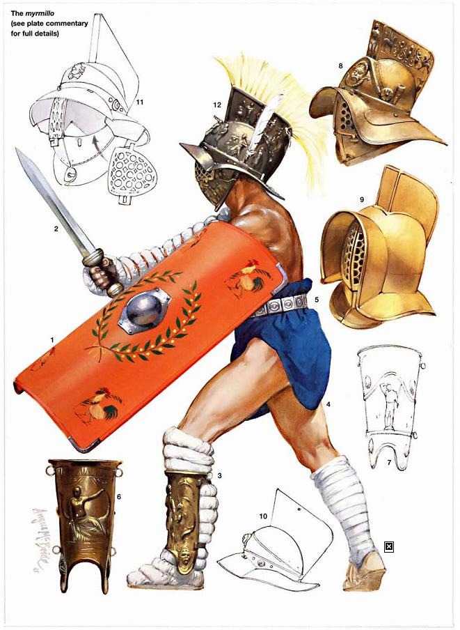 그리고 동방원정에선 주로 다키아(지금의 루마니아 지방) 출신의 검투사가 많은데, 가무잡잡한 피부에 곱슬머리로서 그들 특유의 희어진 칼이 관중들의 시선을 사로잡았습니다. 그래서 갈리아 출신의 검투사와 다키아 출신이 한 조를 이루는 경기가 인기가 높았습니다. 전자는 물고기 검투사로 불리웠는데, 투구 정수리에 물고기 조각이 있었기 때문입니다.