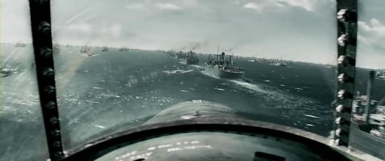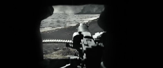 영화는 브래들리의 환청을 따라 그의 과거였던 이오지마 전투 현장으로 순식간에 이동합니다. 영화는 이런 방식으로 피비린내 나는 전쟁터와 전쟁 기금 모금을 위해 기획된 쇼를 오고 갑니다. 그러므로써 영화는 전쟁터와 민간 세계, 즉 양극단의 시공간과 상황을 한 덩어리로 풀어내고 있는 것입니다.
