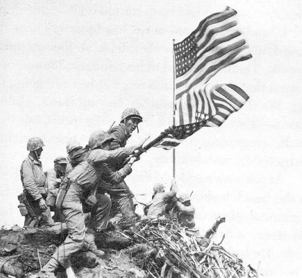 1945년 2월 23일 마침내 섬에 상륙한 미해병대는 섬 점상인 수리바치 섬에 성조기를 꽂습니다. 이때 찍은 사진 한장이 미국 본토를 뜨겁게 달굽니다. 여섯명의 미국 해병대가 이오지마에 성조기를 세우는 모습을 포착한 사진입니다. 매스컴과 정부는 그 사진이 전쟁에 지친 미국 국민들에게 애국심과 희망의 상징이 될 것으로 직감합니다.