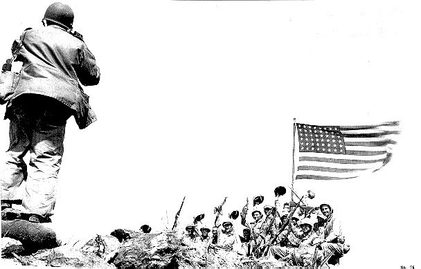 그래서 즉시 원래 성조기보다 훨씬 크고 깨끗한 새로운 성조기를 정상으로 올려 보내 게양했는데 마침 이 모습을 AP의 종군기자가 촬영했습니다. 이것이 바로 그 유명한 해병대의 국기 게양 사진이었습니다.