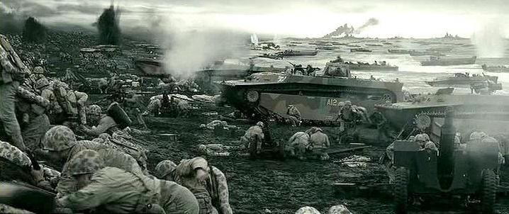 공세로 나선 미군의 물량은 그야말로 어마어마했습니다. 우선 지상군은 해병 제3, 4, 5사단 3개로 구성된 해병대 제5수륙양용군단이었고 군단 총병력은 거의 7만 명을 웃돌았습니다. 이것만으로도 이미 미군은 수비를 맡고 있는 일본군 병력의 3배의 수준이었습니다. 이들을 운반하기 위해 수송선 43척, LST 63척, LSM 31척이 투입되었습니다.