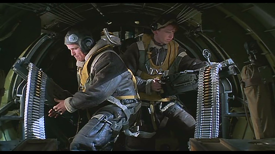 결국 선도기의 중책까지 맡게 되는 <멤피스벨>과 하나둘 추락하는 폭격기들. 부기장을 맡고 있던 루크(테이트 도노반)는 공명심에서 적기를 한 대라도 격추해보고 싶은 욕심에 후미 사수 클레이에게 잠시 자리를 빌려달라고 합니다. 루크의 사격으로 격추되는 적기, 그러나 적기는 추락하며 신참내기인 ‘Mother Country’호의 동체 중간을 동강내고 맙니다. 추락하는 ‘Mother Country’ 의 동체에서 승무원들이 우수수 쏟아집니다.