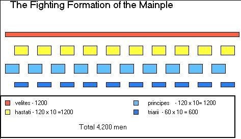 로마 군단은 제1전열에 하스타티 10개 중대, 제2전열에 프린키페 10개 중대, 제3전열에 트리아리 5개 중대를 모아 주력부대를 형성하고, 제1전열 전방에 벨리테스 10개 중대의 정찰부대를 배치했습니다. 따라서 1개 로마 군단은 총 4,200명으로 편성되었다. 그리고 양측방에는 기병 10개 소대 총 300명을 나누어 배치해 로마 군단을 보호하는 임무를 수행하도록 했습니다. 로마군의 규모는 시대에 따라 그리고 전투상황에 따라 다르나, 통상 최고사령관인 통령은 4개 로마 군단 정도를 지휘했습니다.