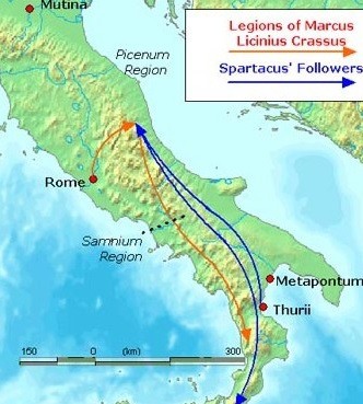 결국, 스파르타쿠스는 홀로 고향으로 돌아가지 않고 그들과 함께 하기로 했으며, 그들의 말에 따라 남쪽으로 향하여 메시나 해협을 건너 풍요로운 시칠리아로 가기로 했습니다. 4만 명에 달하는 노예군은 이탈리아 남쪽 끝에 도착했습니다. 그러나 그들은 메시나 해협을 건너지 못했습니다. 크라수스가 이끄는 로마군이 그 곳을 봉쇄하고 있었기 때문이었습니다.
