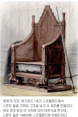 이때부터 에드워드 1세는 아예 스코틀랜드에 대한 종주권을 주장하고 나서며 잉글랜드와 스코틀랜드의 왕임을 선포했습니다. 게다가 스코틀랜드 왕권의 상징이었던 '운명의 돌'과 가장 신성하게 여기는 성 마가렛의 검은 십자가상마저 1296년에 빼앗아 런던 웨스터민스터 사원으로 가져가 버렸습니다.