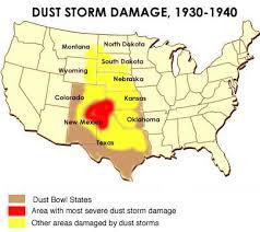 최악의 가뭄은 1934년과 1939년의 가뭄이었고, 최악의 먼지 폭풍은 1935년에 발생했습니다. 더스트 볼은 한때 비옥했던 땅을 황무지로 바꾸어 놓았습니다. 거대한 먼지 폭풍이 오클라호마 주와 텍사스 주, 캔자스 주, 콜로라도 주, 뉴멕시코 주, 그리고 심지어 동부에 위치한 주까지 휩쓸고 지나갔습니다.