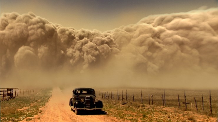 그러나 1930년대 초반부터 대평원에 재앙이 찾아들었습니다. 무성하던 풀밭이 사막으로 변하고 한 치 앞을 분간할 수 없는 먼지 폭풍이 일었습니다. 세상이 꼭 먼지 구덩이(Dust Bowl) 같았습니다. 여름 기온이 5℃에서 43℃를 오가는 이상 기후에 비도 내리지 않아 강줄기가 메말랐습니다.