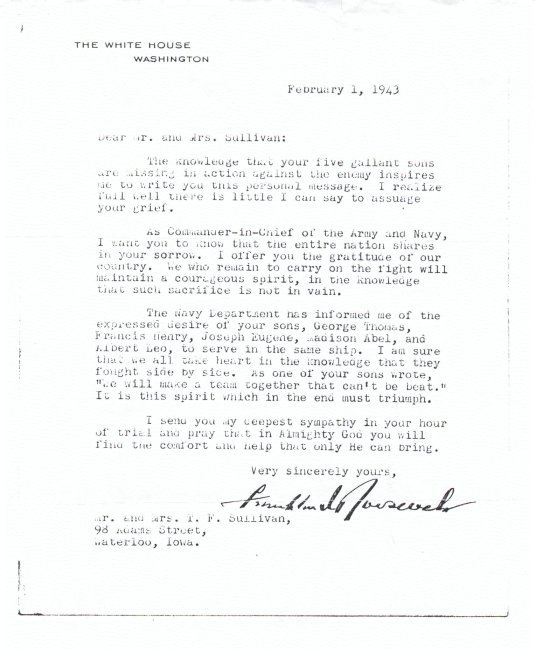그해 8월이 되어서야 미 해군은 공식적으로 주노함의 침몰 사실을 인정하고 사상자 수를 발표했습니다. 설리번 형제가 목숨을 잃은 지 9개월 만이었죠. 루즈벨트 대통령이 편지를 보내 부부를 위로했습니다.