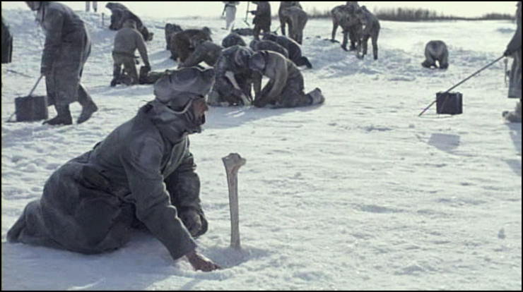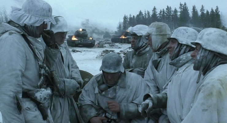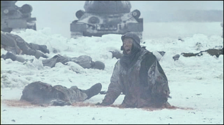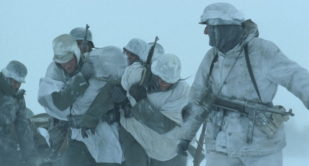 엄청난 희생을 강요하는 전투 중 한스 일행은 부상병을 치료했다는 이유로 헌병대에 체포돼 항명이라는 죄목으로 러시아 포로와 함께 지뢰 제거반으로 끌려가게 됩니다. 그곳에서는 성탄절 임에도 불구하고 병사들이 온통 굶주려 있었으며 살을 여미는 듯한 러시아의 혹한으로 인해 죽은 병사들의 시체는 뻣뻣한 목재처럼 길가에 쌓여있는 지옥과 같았습니다.