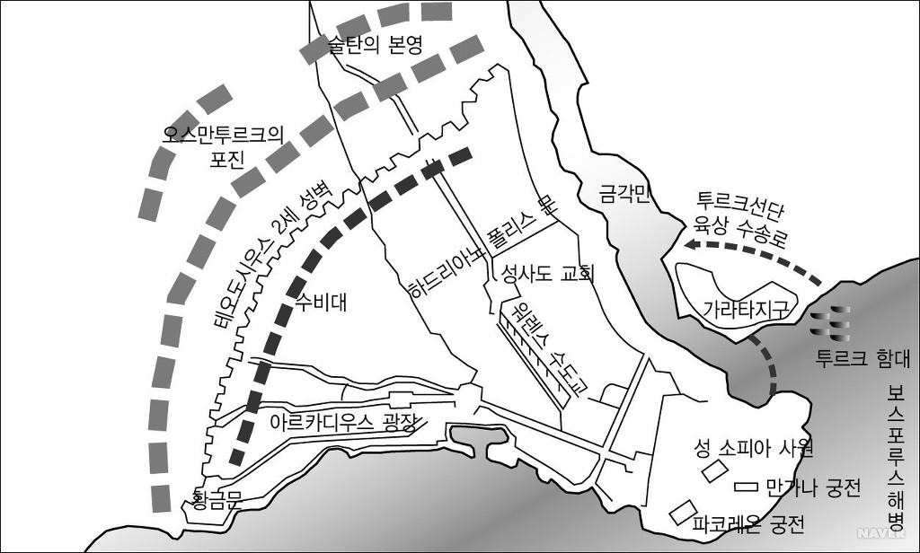 메메드 2세가 볼 때 금각만을 방어하는 성벽이 상대적으로 취약한 부분이었습니다. 이 점을 잘 알고 있던 콘스탄티누스 황제도 금각만을 가로지르는 쇠사슬을 쳐서 이슬람 해군의 접근을 막았습니다.