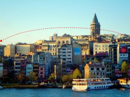 * 현재의 가라타(갈라타) 지역, 화살표가 배를 운반한 방향을 가리킵니다