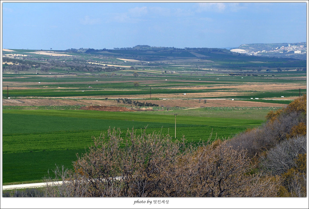 멀리 6km 너머 들판의 끝은 바다. 10만의 그리스군이 1천척의 전선(戰船)을 몰고와 새까맣게 갖다 댔던, 호메로스가 헬레스폰테 바다라고 부른 다다넬즈 해협 입구입니다.