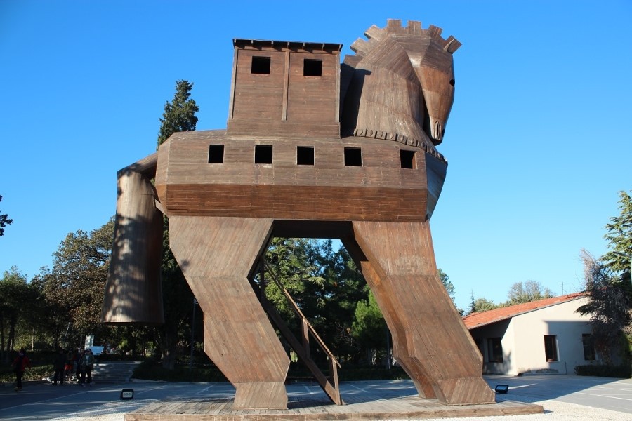 트로이 성(城)의 유지(유지)로 들어가는 입구에는 거대한 목마(木馬)가 서서 앞을 가립니다. 관광객들이 목마의 배 밑에 난 사다리를 타고 안으로 올라가 옆구리에 뚫린 창 밖으로 얼굴을 내밀어 손을 흔듭니다.