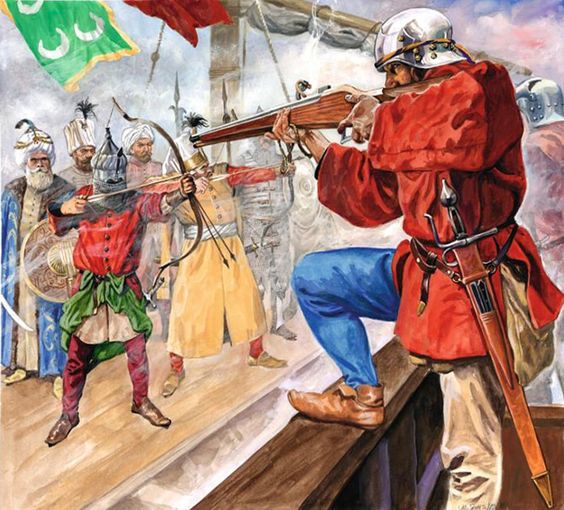 중앙에서의 전투는 다소 시간을 끌었지만 괴물 같은 갈리아스 선이 마구 설쳐대기 시작하자 투르크 함대의 전열이 흔들리기 시작했습니다. 많은 투르크인들은 화승총에 쓰러졌습니다. 또한 신성동맹 측 함선에 타고 있던 노잡이들은 병사들과 마찬가지로 자유 시민이었고, 일단 전투가 벌어지면 그 즉시 무기를 빼들고 싸울 수 있는 전투원으로 바뀌었습니다.