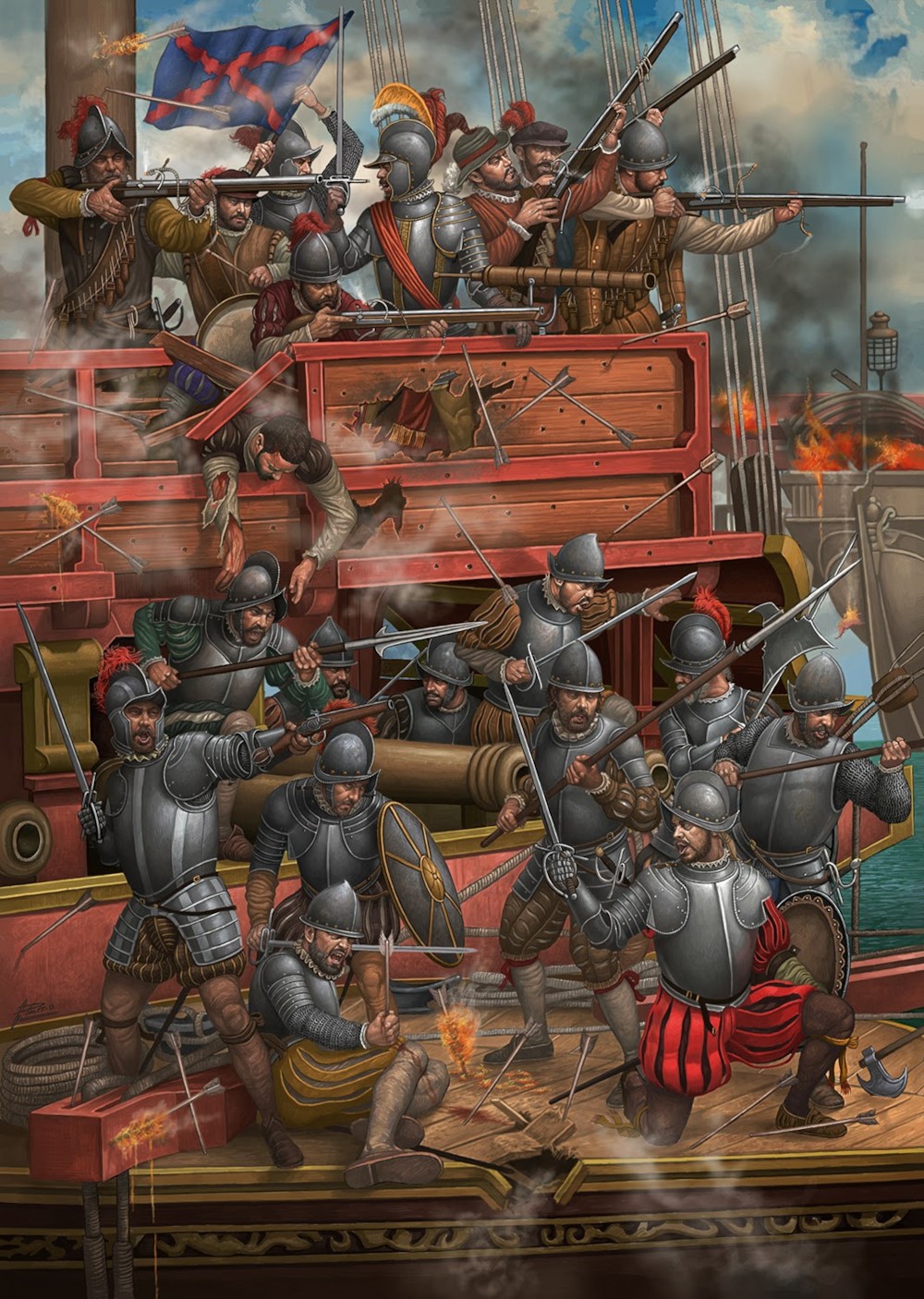 당시 해상에서의 전투는 배끼리 부딪치고, 배에 기어올라 싸우는 것이 전부였습니다. 기어올라 싸우는 전투 병력은 신성동맹 측 20,000명, 투르크 측 16,000명이었습니다. 노를 젓고 항해하는 데 투입된 이른바 노잡이들은 이보다 훨씬 많아 각각 64,000명과 72,000명이었습니다.